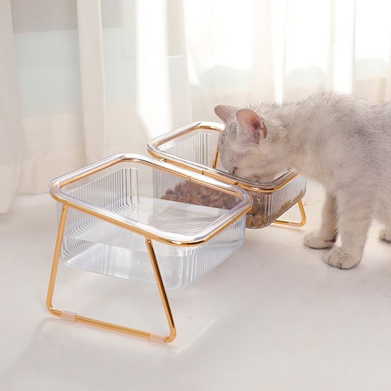 Materiali di alta qualità: Questo ciotola è realizzata in plastica PC ecologica, assicurando durata e sicurezza per il tuo felino. La base di supporto è costruita in ferro placcato in oro e gomma morbida per garantire stabilità e funzionalità antiscivolo.