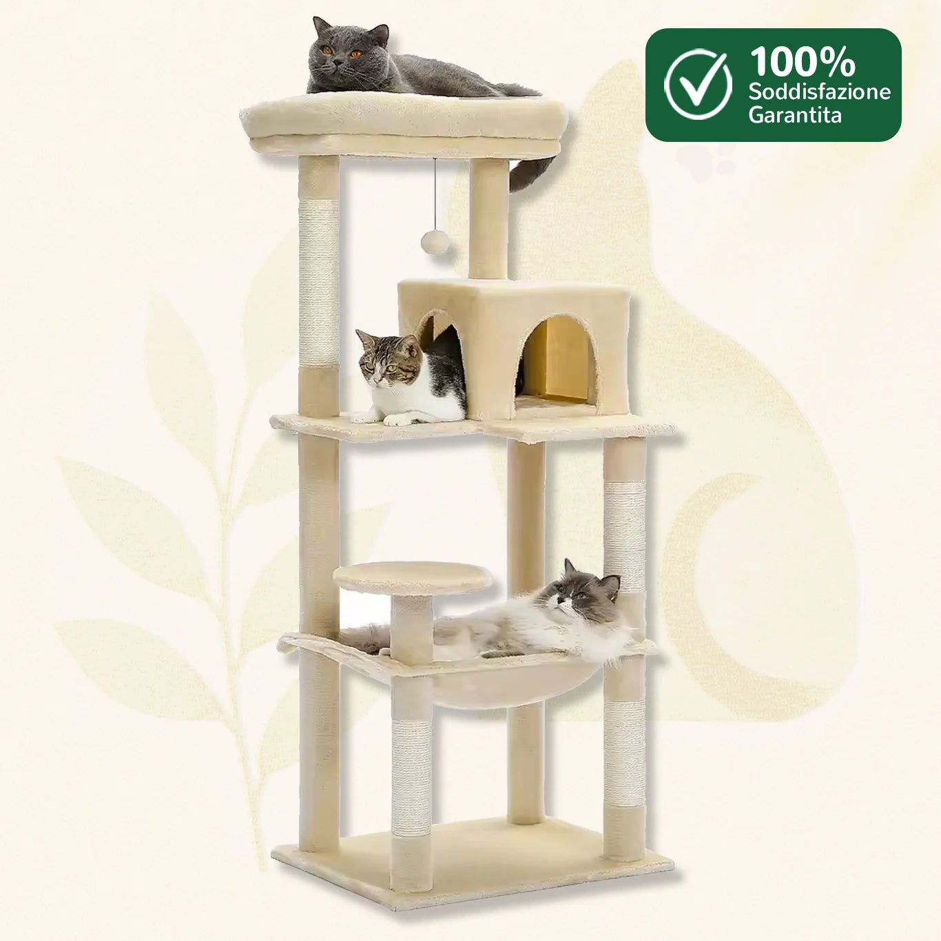 Realizzato in legno robusto, con pali in sisal naturale e piattaforme imbottite, questo albero è pensato per resistere nel tempo, offrendo al tuo micio un rifugio sicuro per arrampicarsi, graffiare e rilassarsi.
