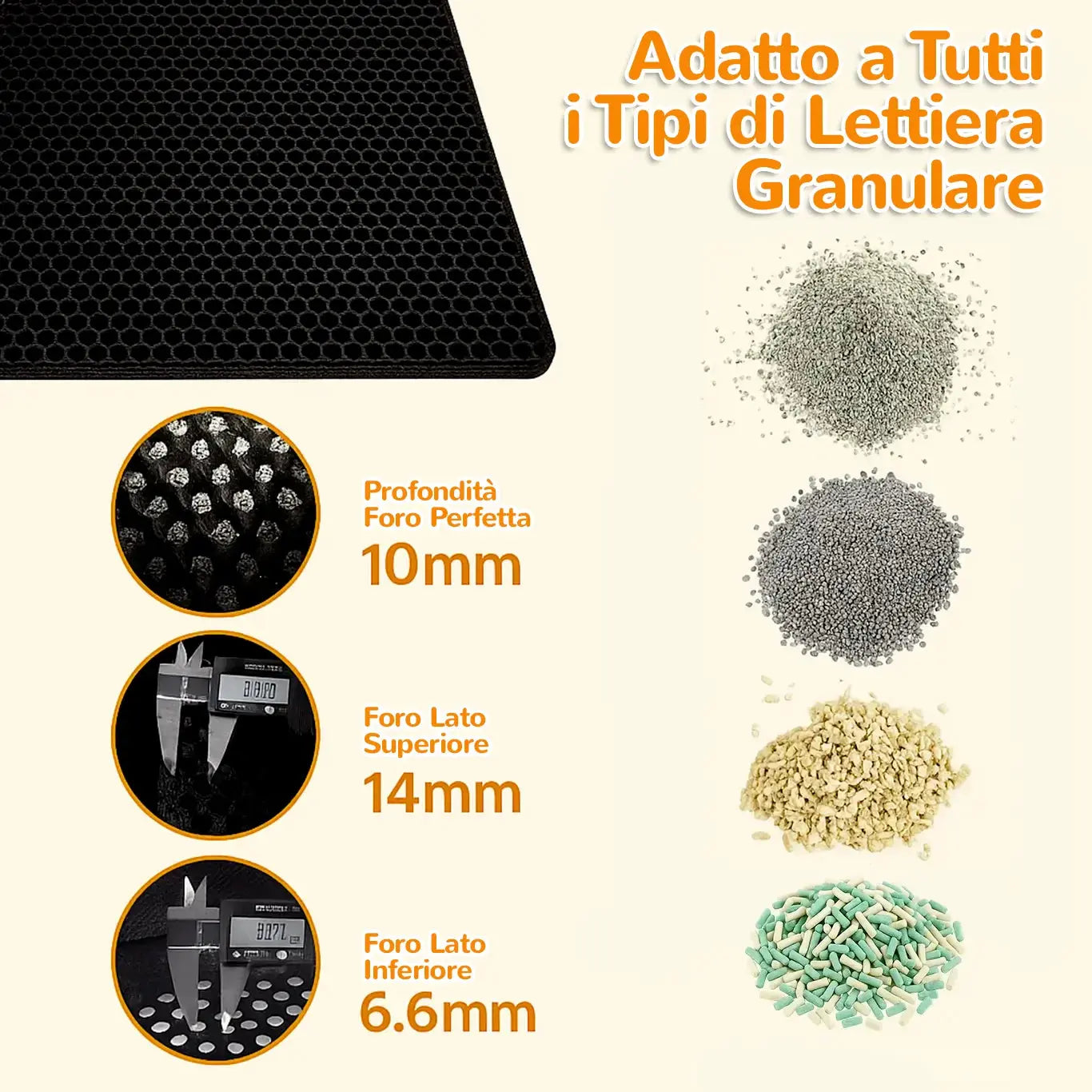 Sì ✅ MiloMat™ è compatibile con tutte le lettiere granulari: sabbia fine, cristalli di silicio, pellet o agglomerante. È il tappetino anti-lettiera ideale per ogni tipo di cassetta.