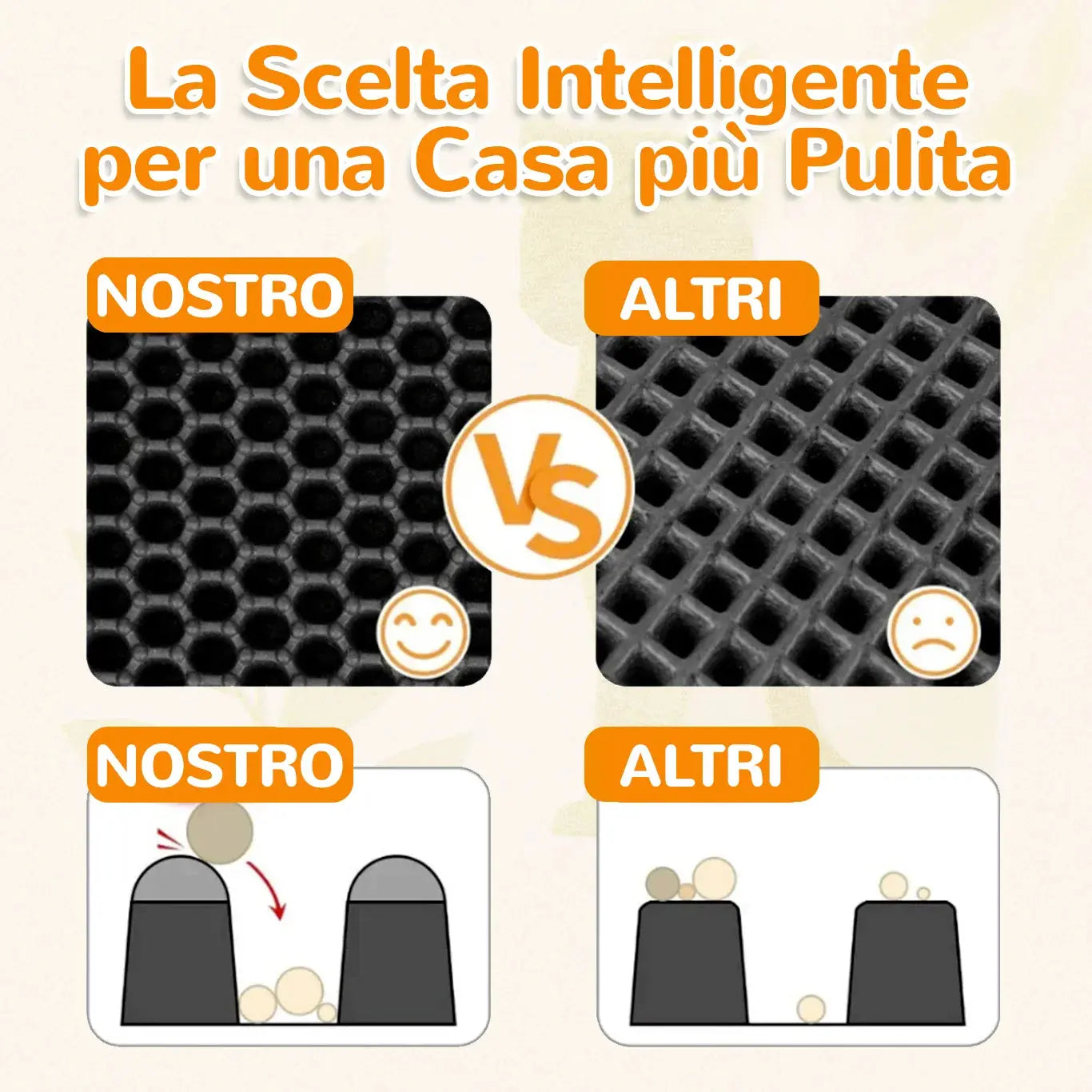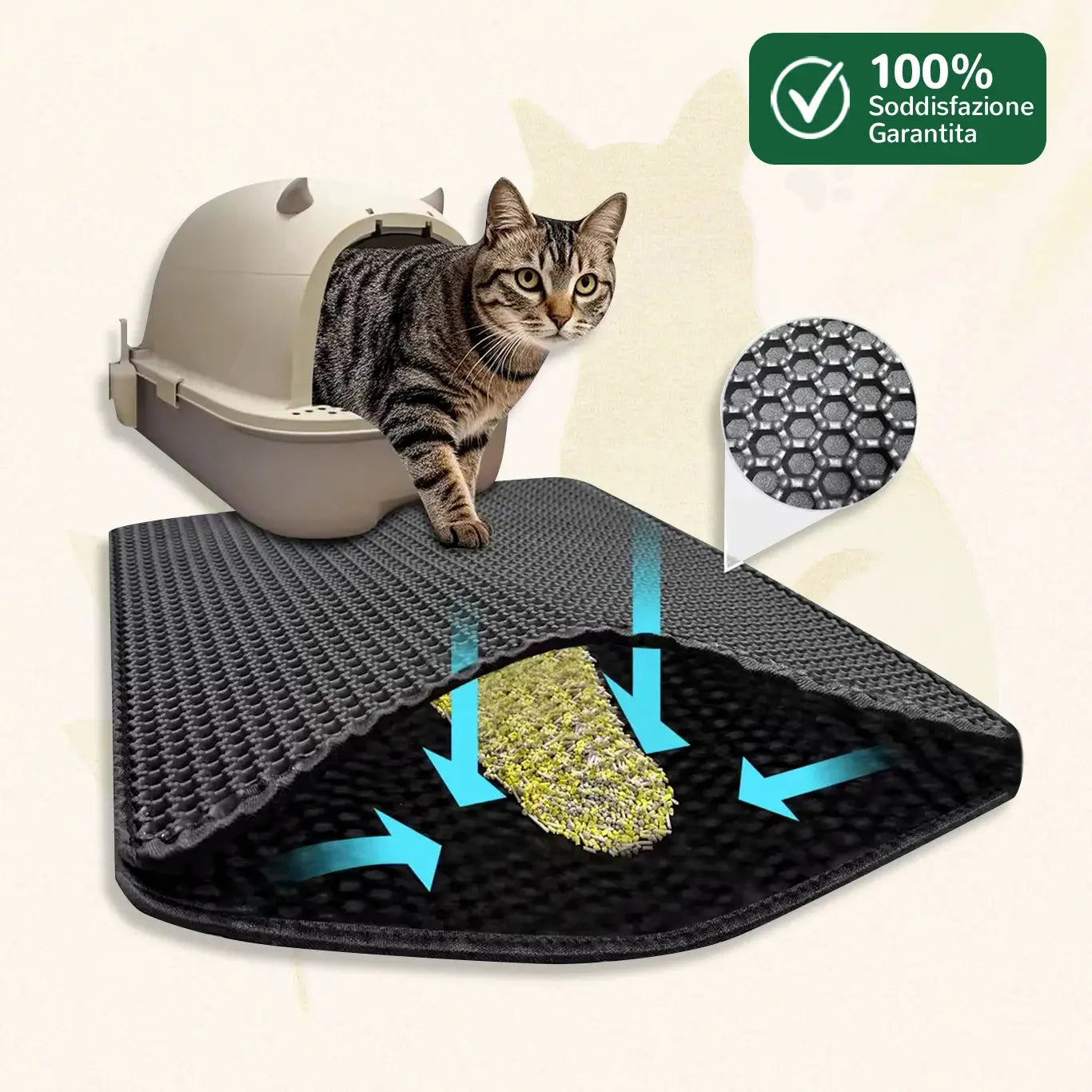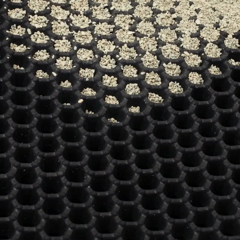 Grazie al design a nido d’ape a doppio strato, MiloMat™ trattiene fino al 90% della lettiera sparsa. Risultato → pavimenti puliti e risparmio fino al 30% sulla sabbia ogni mese.