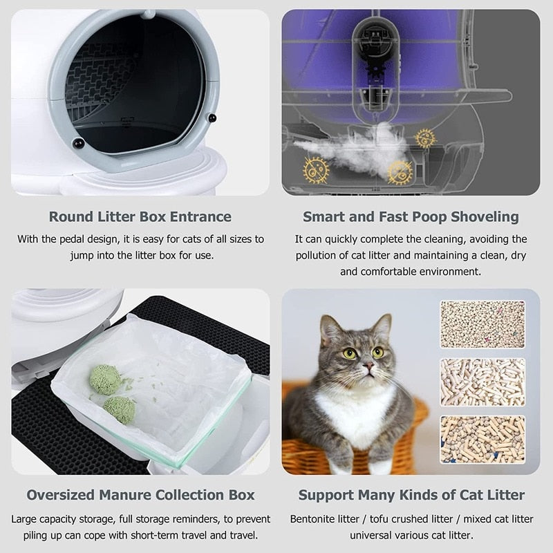 Automatic Scooping: This innovative litter box features an automatic scooping mechanism that rakes through the litter, removing waste and keeping the box clean and odor-free.